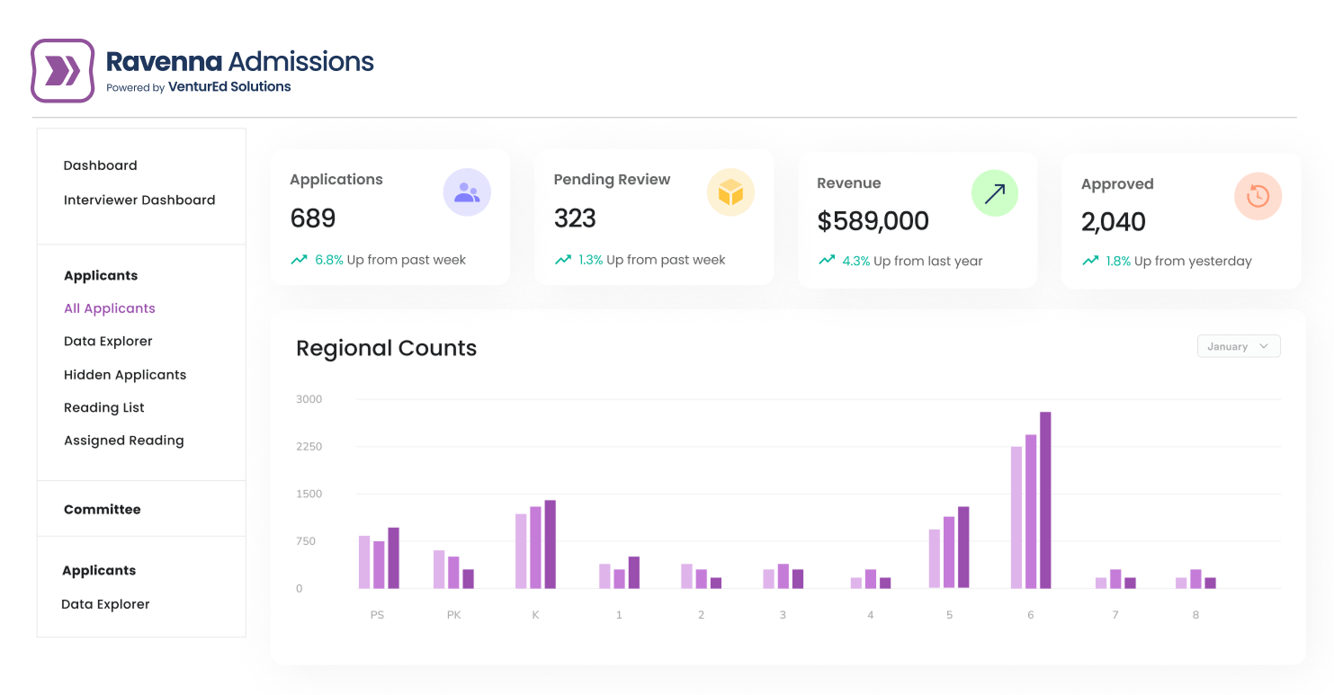 A screenshot of Ravenna Admissions and Enrollment Software that highlights data and analytics for regional enrollment trends
